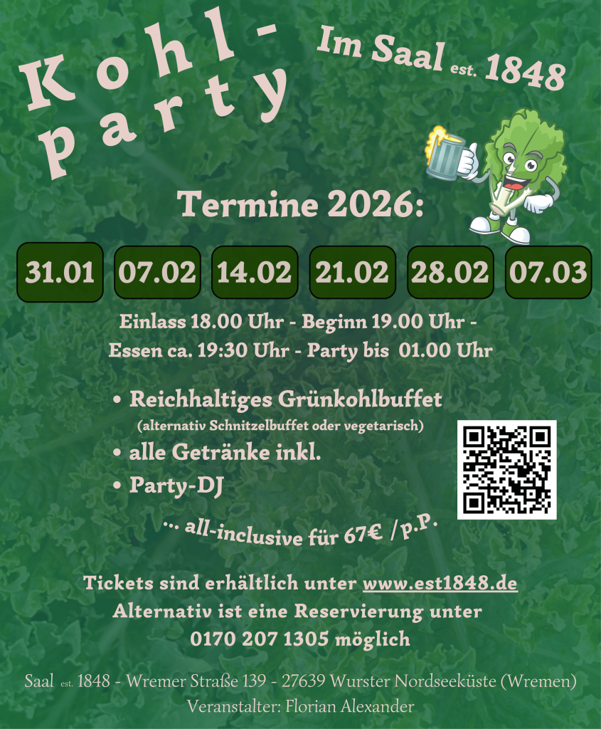 Sichert euch daher also schnellstmöglich eure Tickets für unsere Grünkohlparty in 2026!